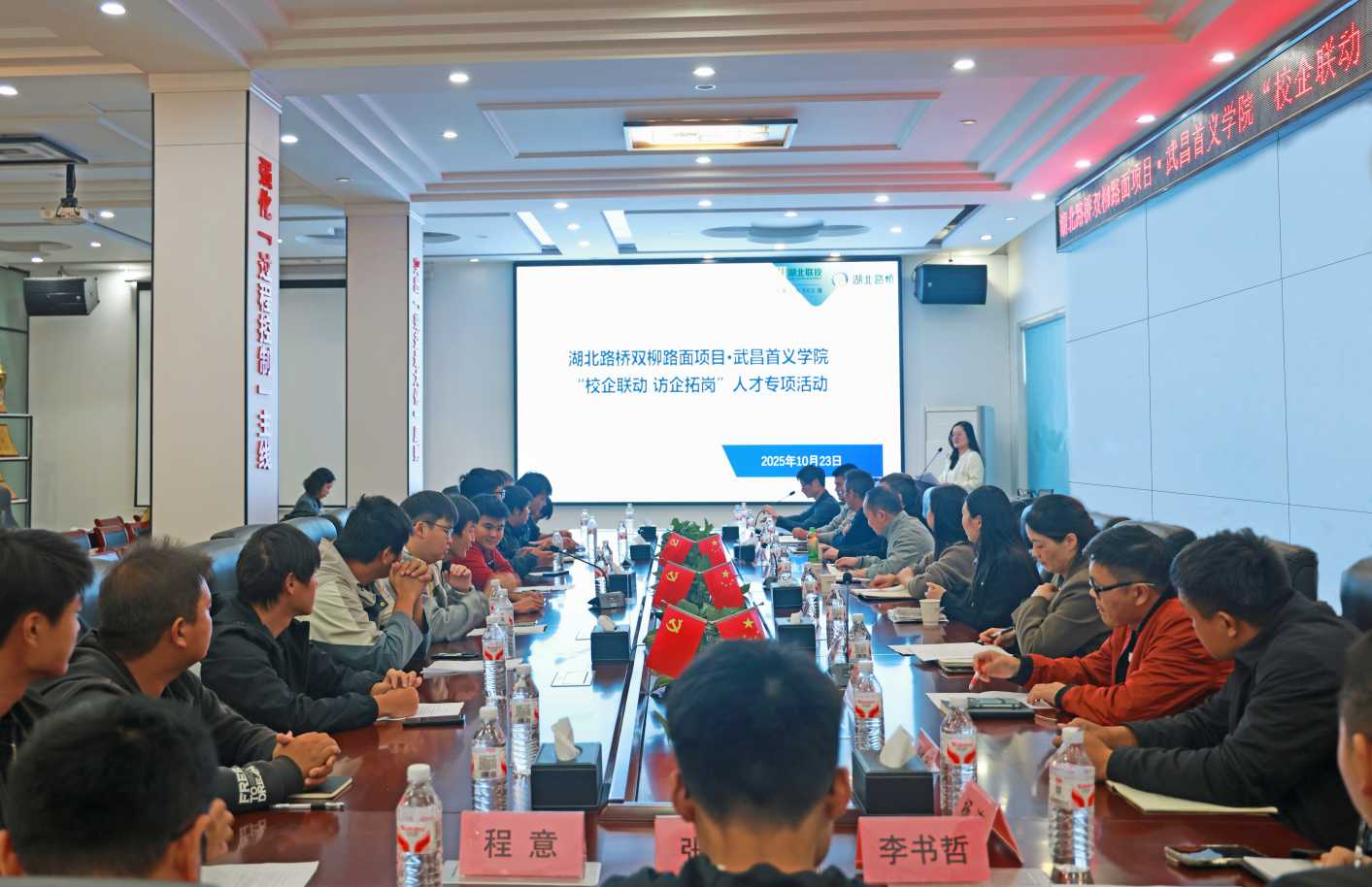 為深化產教融合、推動校企協同育人,10月23日下午,湖北路橋雙柳長江大橋路面項目部聯合武昌首義學院開展“校企聯動 訪企拓崗”人才專項活動,與武昌首義學院校企合作處處長、教務處副處長周自倫等座談交流。